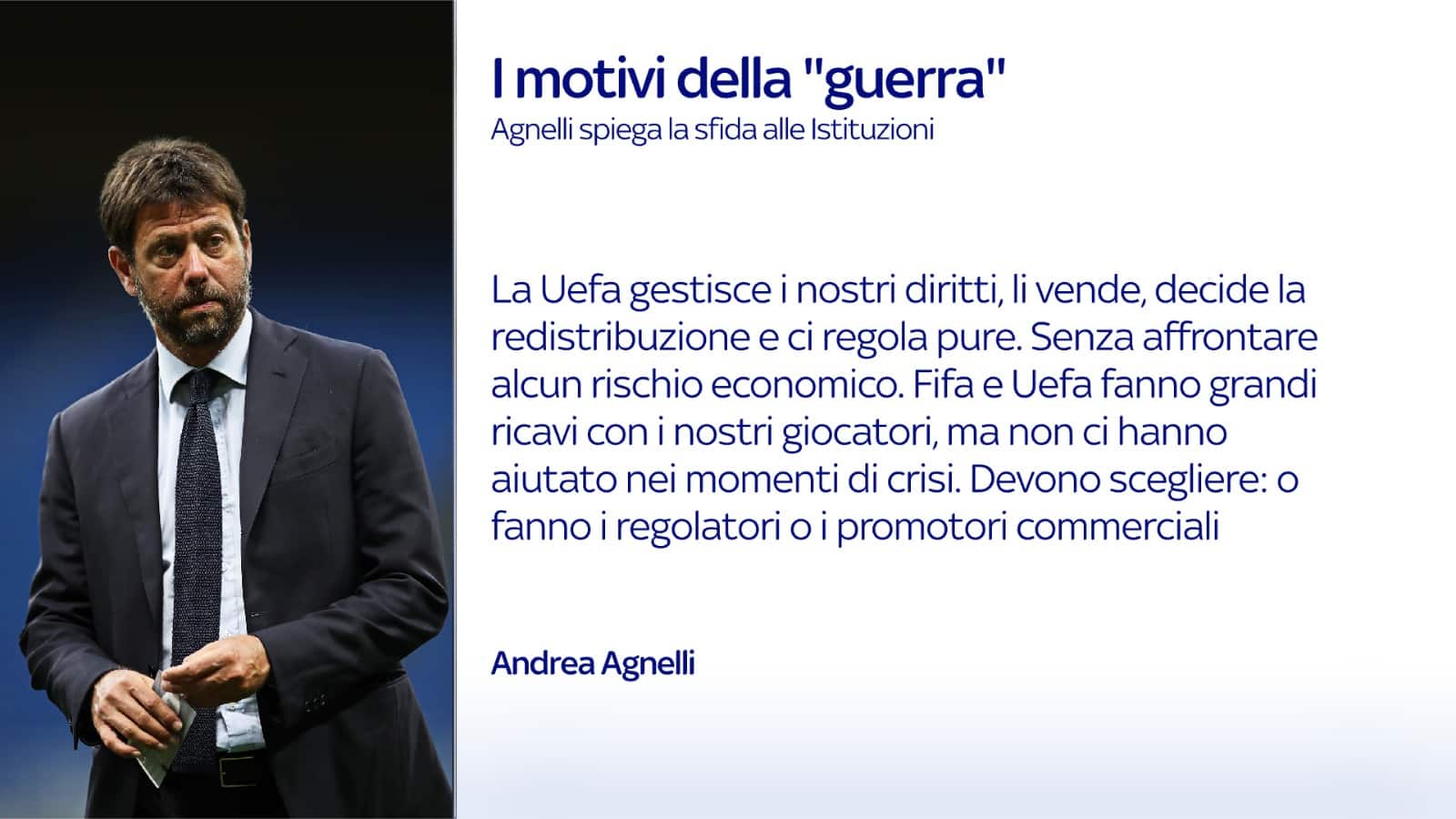 Una competizione che, come spiega lo stesso Agnelli, "rimane aperta e prevede cinque posti a disposizione degli altri club. Per merito sportivo o su invito? Questo fa parte del dialogo che abbiamo richiesto alla istituzioni, il maggior problema dell’industria del calcio è la stabilità. La Uefa non corre alcun rischio nell’attività che regolamenta, ne trae solo benefici. Loro gesticono i diritti, li vendono, decidono quanto distribuirne, e ci regolamenta. O sono regolatori o sono promotori commerciali. Scelgano cosa vogliono essere. Tutti noi nasciamo come un gioco e abbiamo statuti e regole del gioco, ma non possiamo più lanciare il dado e vedere che numero esce, oggi siamo un’industria da 25 miliardi”. Per concludere, il presidente della Juve ha affermato: "L'arrivo di Ronaldo ha portato benefici anche alle altre società. Si possono quantificare in 4 milioni l’anno a squadra soltanto di botteghino. Desideriamo continuare a importare altri campioni con benefici per tutti i livelli del calcio, dai più giovani ai dilettanti. Se ho mai pensato di aver sbagliato a compare Cristiano? Mai, lo riprenderei domani mattina. Pirlo? Anche".