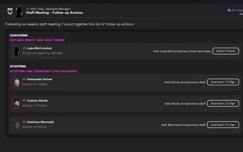 Come sempre, lo staff è pronto a consigliare su qualsiasi aspetto: dai calci piazzati alla scelta del capitano. Dalla tattica alle indicazioni sui singoli giocatori. O sul mercato: ti diranno chi vuole un rinnovo, i profili più interessanti, le occasioni. E non può mancare il livello psicologico, come aggiornamenti dallo staff su "cambiamenti di personalità, sulle gerarchie all'interno dello spogliatoio e su eventuali malcontenti dovuti all'allenamento".