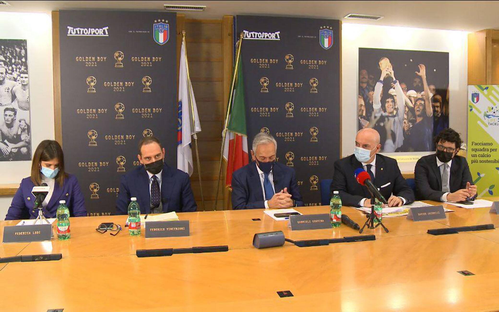 Presente alla conferenza il presidente della Figc, Gabriele Gravina, che ha detto: "Il Golden Boy è un premio che ormai conosce diverse edizioni e per me è un motivo di grande orgoglio presenziarlo. Devo riconoscere e consegnare un attestato di stima per la grande professionalità al direttore Jacobelli, che con questi progetti consente di essere in linea e far crescere tutto il movimento della nostra galassia calcistica". Gravina ha aggiunto: "Nel giorno della mia prima elezione avevo parlato di nuovo umanesimo e rinascimento, puntando su infrastrutture e valorizzazione dei giovani, consegnando il messaggio al Club Italia affinché tanti giovani potessero raccontare agli italiani una nuova fase. È un un progetto che non si è esaurito né a Basilea, né a Belfast: continueremo a investirci. Ringrazio il direttore per questo assist che ci fornisce ogni anno per la valorizzazione dei giovani".