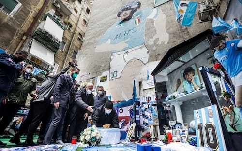 Dopo aver deposto il grande numero 10 formato da rose bianche e azzurre il presidente De Laurentiis ha affermato guardando la bella fotografia che arreda uno degli 'altarini': "Ha la faccia di un attore e mi piacciono le ali dorate accanto al suo volto come quelle di un mito, un intoccabile mito come quelli dell'Olimpo".
