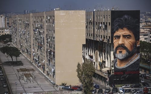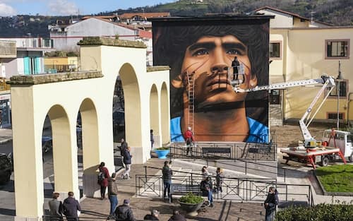 È il secondo affresco che Jorit dedica a Maradona dopo quello di San Giovanni a Teduccio del 2017, un'immagine enorme che prende l'intera facciata di un edificio di 10 piani.