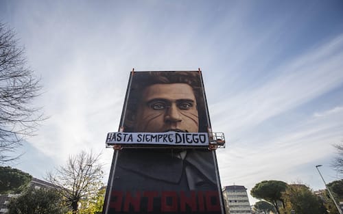 "HASTA SIEMPRE DIEGO". Uno striscione bianco di grandi dimensioni, appeso sul murales dedicato ad Antonio Gramsci in via Canova a Firenze: era stato questo invece il modo in cui Jorit - impegnato il 25 novembre a completare l'opera nel capoluogo toscano - aveva voluto salutare per l'ultima volta Maradona.