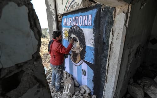 SIRIA. Ma Diego è ovunque, anche tra le macerie della guerra. Il 27 novembre del 2020 il graffitaro Aziz Esmer ha reso omaggio a Maradona nei dintorni di Assad, dipingendo l'inferno siriano con i colori del cielo, nel nome di "Dios".