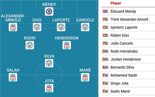 Manchester City e Liverpool si spartiscono equamente le posizioni per i giocatori di movimento, con 5 elementi a testa: i Citizens forniscono prevalentemente la difesa, i Reds il tridente d'attacco al completo. Il portiere, però, lo mette il Chelsea