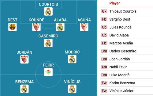 La crisi del Barcellona è testimoniata anche dal fatto che un solo elemento blaugrana trovi spazio nella top 11 della Liga. Per il resto domina il Real Madrid (6 giocatori, almeno uno in ogni reparto), dà il suo contributo anche il Siviglia.