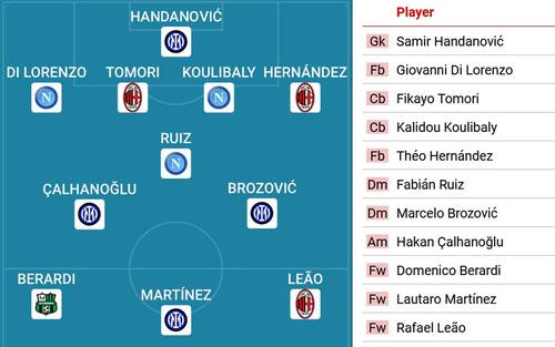 Ecco schierati i migliori 11 del campionato italiano secondo i parametri del Cies. L'Inter è la squadra più rappresentata con 4 giocatori, seguono Napoli e Milan (3 ciascuno).