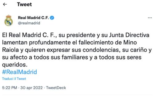 Non soltanto i club italiani, anche all'estero la notizia della morte di Mino Raiola ha avuto una forte eco. Questo il messaggio del Real Madrid, che si è stretto così alla famiglia del procuratore