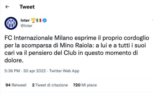 Come il club rossonero, anche l'Inter ha twittato ricordando la figura di Raiola