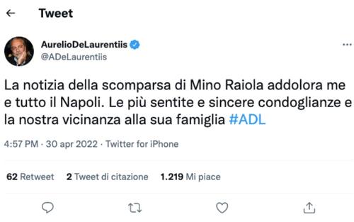 Come fa solitamente per annunciare questioni legate al Napoli, Aurelio De Laurentiis ha utilizzato il suo profilo Twitter per esprimere vicinanza alla famiglia del Napoli anche a nome della sua società: "La notizia della scomparsa di Mino Raiola addolora me e tutto il Napoli. Le più sentite e sincere condoglianze e la nostra vicinanza alla sua famiglia", le parole del presidente azzurro