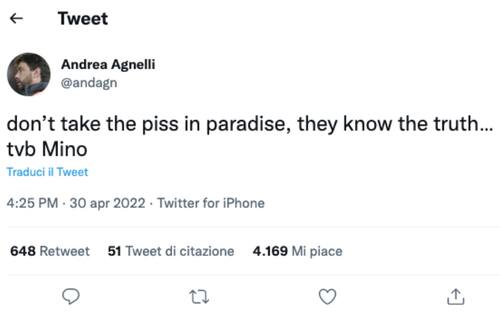 Il presidente della Juventus, Andrea Agnelli, ha invece scelto il suo profilo personale per ricordare Mino Raiola. Il numero uno bianconero ha dedicato un pensiero al noto procuratore, con il quale era in ottimi rapporti: "Non prendere in giro in Paradiso, loro sanno la verità... tvb Mino", ha scritto Agnelli
