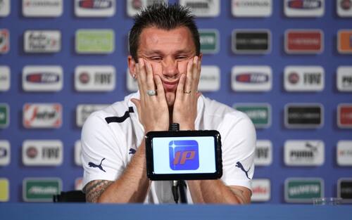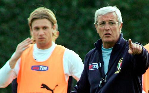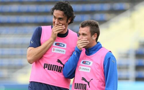 - Con il ct Donadoni torna anche in Nazionale, e gioca -senza segnare- l’Europeo del 2008. Eccolo con Luca Toni in uno degli atteggiamenti in campo che lo hanno reso più celebre: mano davanti alla bocca, per non far intendere a nessuno che cosa stia dicendo