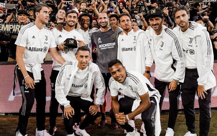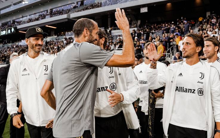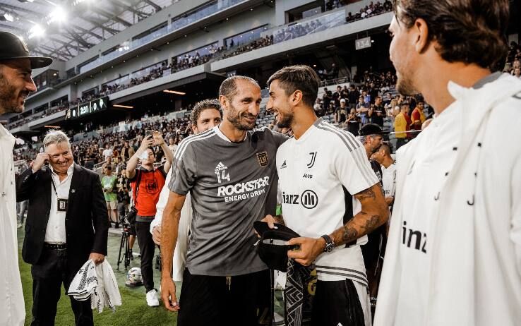 Esordio casalingo, maglia da titolare (in campo 72’) e un successo davanti a dei tifosi speciali: i suoi ex compagni di squadra della Juventus. Serata (nottata ora italiana) perfetta o quasi quella di Giorgio Chiellini, che con i suoi Los Angeles FC ha battuto per 2-1 i Seattle Sounders al Banc of California Stadium. A fare il tifo per il difensore italiano da bordocampo c’erano infatti Dusan Vlahovic, Leonardo Bonucci, Juan Cuadrado, Angel Di Maria, Manuel Locatelli, Luca Pellegrini, Mattia Perin e l’allenatore della Juve Max Allegri, presenti in America per la tournée pre-stagione (nella notte tra sabato e domenica sfiderà il Real in amichevole). Abbracci e pacche sulle spalle prima dell’inizio del match, poi tifo per "Re Giorgio" durante il corso della gara.