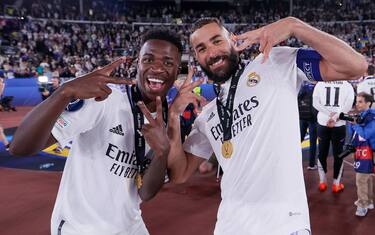 URLANDO CONTRO IL CIELO - Karim Benzema alza al cielo la quinta Supercoppa europea nella storia del Real Madrid, può iniziare la festa dei blancos ad Helsinki