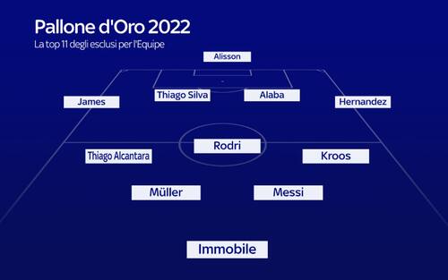 Il quotidiano francese L'Equipe ha pubblicato la top 11 dei giocatori esclusi dalla lista dei candidati al Pallone d'Oro 2022. Spicca, ovviamente, il nome di Lionel Messi, ma ci sono anche due giocatori della Serie A. Chi sono gli altri? Ecco la formazione, schierata con un ideale 4-3-2-1