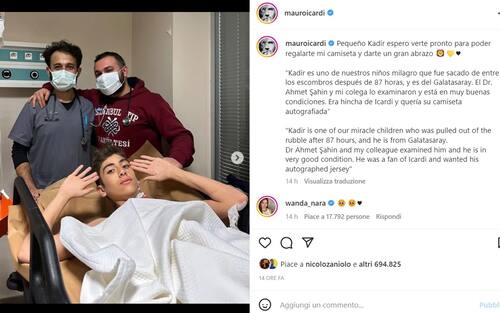 - A proposito di ex Serie A e di attuali calciatori del Galatasaray, Mauro Icardi ha pubblicato su Instagram la foto di Kadir, un suo giovanissimo fan che, estratto miracolosamente vivo dalle macerie, ha “esultato” proprio come Maurito dal letto del suo ospedale