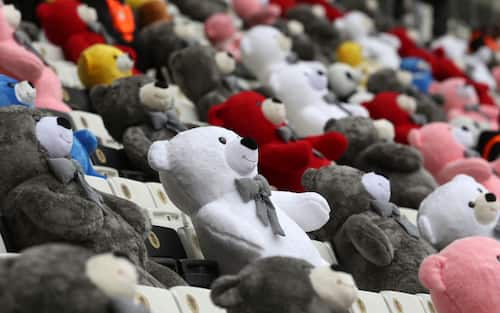 - Dagli spalti, da tutti i settori dello stadio, sono piovuti in campo migliaia di peluche e giocattoli
