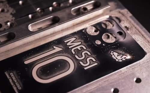- Ecco una delle fasi della lavorazione dell'Iphone d'oro personalizzato di Messi, con l'incisione di nome, numero, stemma...