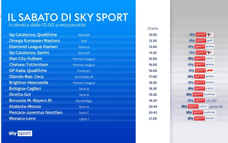 Un giro del mondo dello sport che parte dai campi della nostra Serie A: sabato 2 settembre Bologna-Cagliari (alle 18.30 su Sky Sport Calcio e NOW) e Atalanta-Monza (alle 20.45 su Sky Sport Calcio e NOW), domenica Empoli-Juventus (alle 20.45 su Sky Sport Summer, Sky Sport Calcio e NOW), seguita dall’appuntamento con Sky Calcio Club (dalle 22.45 su Sky Sport 24, Sky Sport Calcio e NOW). Tutte le dieci sfide della 4^ giornata di Serie B saranno in diretta su Sky e in streaming su NOW, con l’opzione ‘Diretta Gol’ (sabato 2 settembre alle 18.30 su Sky Sport Summer e NOW, domenica alle 18.30 su Sky Sport Calcio e NOW). Al via anche la stagione 2023/2024 della Serie C NOW; tutte le partite della 1^giornata saranno live su Sky e in streaming su NOW, a partire da Catania-Crotone, giocata venerdì 1 settembre alle 19.45: tra le altre, sabato 2 settembre sera alle 20.45 su Sky Sport Summer e NOW la sfida tra Pescara e Juventus Next Gen. In arrivo i gol dei più bei campionati d’Europa. In Premier League si è partiti con Luton-West Ham, poi spiccano Manchester City-Fulham (sabato alle 16 su Sky Sport Calcio e NOW) e Arsenal-Manchester UTD (domenica alle 17.30 su Sky Sport Summer e NOW), in Bundesliga Borussia Moenchengladbach-Bayern Monaco (sabato alle 18.30 su Sky Sport 257 e NOW), mentre in Ligue 1 si attende domenica sera per vedere il PSG in campo a Lione (alle 20.45 su Sky Sport 259 e NOW).
