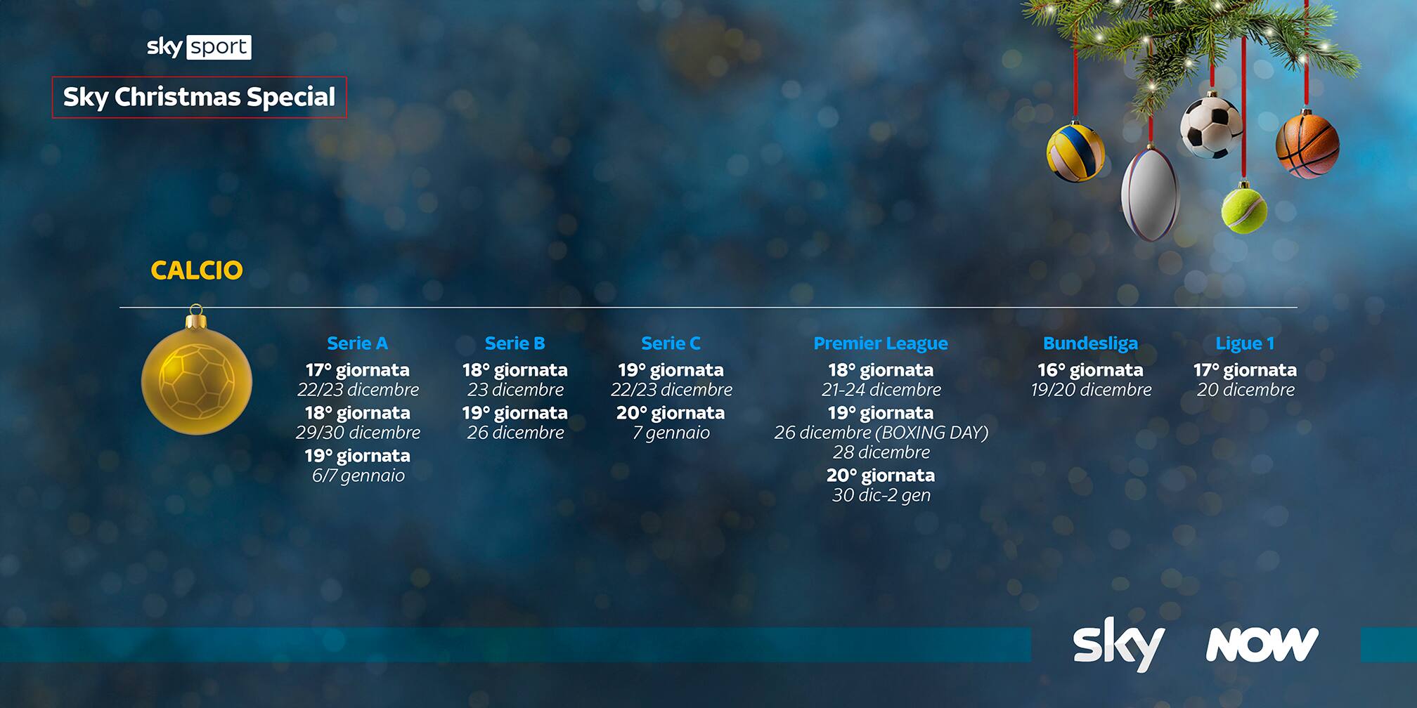 Il grande sport di Sky e NOW non si ferma durante le festività natalizie. Ogni giorno, ogni ora un grande evento contribuirà a rendere ancora più speciali i momenti che, da tradizione, dedichiamo alla famiglia e agli affetti.
