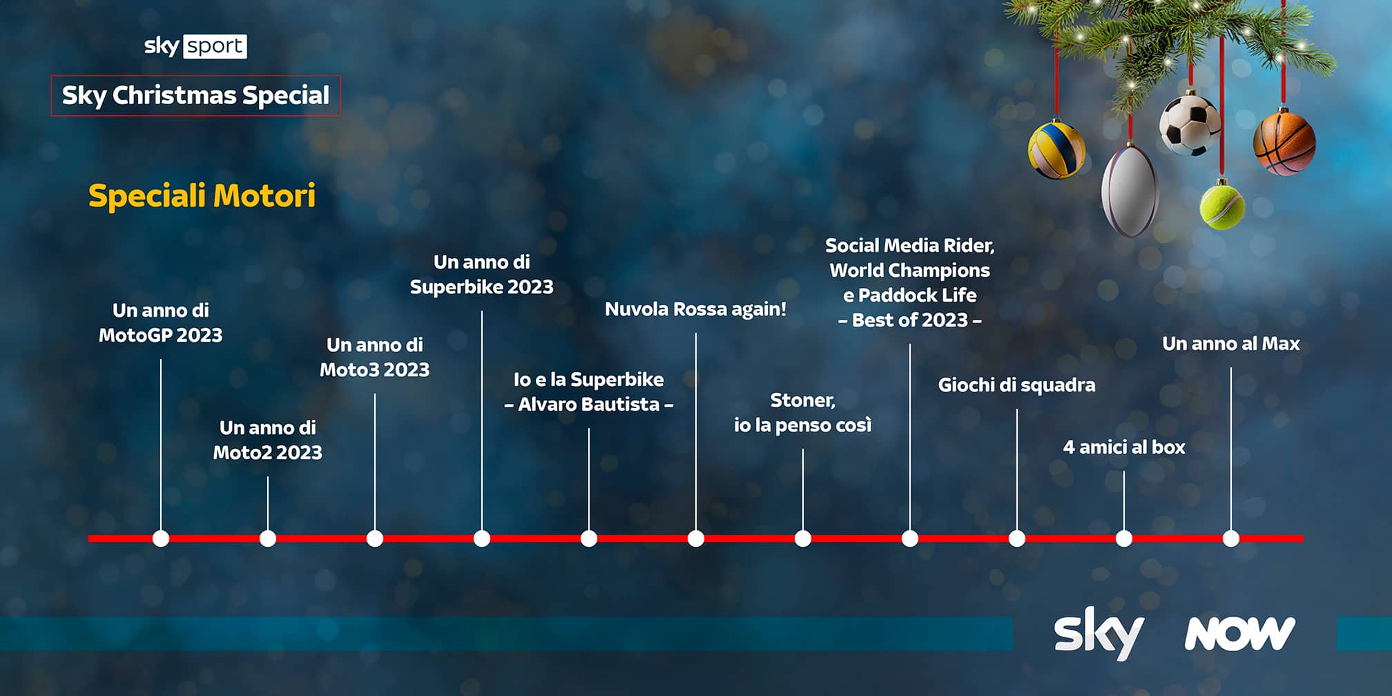 A partire dalle due ruote su Sky Sport MotoGP e in streaming su NOW, con i review della stagione 2023 della top class, appena conclusa con il successo tricolore del ducatista Pecco Bagnaia, oltre a quelle di Moto2, Moto3 e Superbike. E ancora, le produzioni originali sulle grandi storie del motociclismo di quest’anno, come Nuvola Rossa again!, dedicato al campione del mondo della MotoGP e nel quale viene raccontata tutta la sua stagione; la Superbike, con un'intervista esclusiva al campione del mondo Alvaro Bautista; Stoner, io la penso così, una lunga chiacchierata con Casey Stoner in cui si affrontano molti aspetti della MotoGP di oggi e dei piloti che partecipano al campionato; Social Media Rider, World Champions e Paddock Life – Best of 2023, realizzati da Rosario Triolo con un occhio di riguardo al mondo social dei campioni del Motomondiale e alla vita del paddock della Moto2 e Moto3. Da non perdere anche gli appuntamenti con gli speciali della Formula 1 in onda su Sky Sport F1 e in streaming su NOW: tra questi, Giochi di squadra, con i due piloti della Ferrari Charles Leclerc e Carlos Sainz che si mettono in gioco rispondendo a una serie di quiz insieme a Federica Masolin e Davide Valsecchi; 4 amici al box, una chiacchierata tra addetti ai lavori per fare un bilancio del 2023 e analizzare il momento della F1 con Günther Steiner, Mario Isola, Roberto Chinchero e Giorgio Piola; e ancora, Un anno al Max, l’intervista a Max Verstappen realizzata da Sky Sport dopo il titolo mondiale.