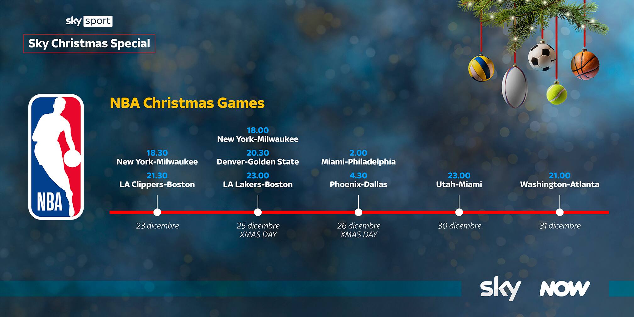 - L’agenda della NBA è piena di appuntamenti: durante le festività natalizie si giocherà ogni giorno e le partite principali saranno live su Sky e in streaming su NOW. Domenica 23 in campo New York-Milwaukee alle 18.30 e LA Clippers-Boston alle 21.30. Poi l’attesissimo NBA Xmas Day con cinque spettacolari sfide, una dopo l’altra, il 25 dicembre: si parte alle 18 con New York-Milwaukee, poi Denver-Golden State alle 20.30, LA Lakers-Boston alle 23, Miami-Philadelphia alle 2 e Phoenix-Dallas alle 4.30. Anche per l’ultimo weekend del 2023 si prepara uno spettacolo di alto livello: Utah-Miami sabato 30 dicembre alle 23, Washington-Atlanta domenica 31 alle 21.