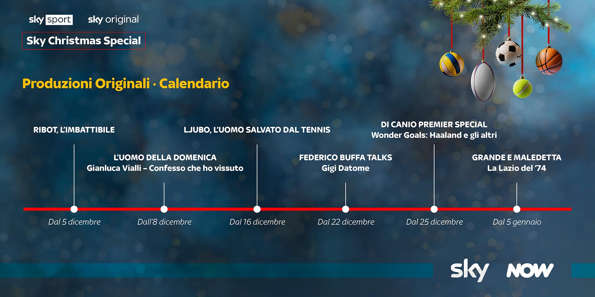 Dal 5 dicembre e per tutto il mese di dicembre niente soste fino al nuovo anno, con una lunga sequenza di eventi spettacolari e racconti unici, a partire dalle 6 nuove produzioni originali firmate Sky Sport. Ad inaugurare la serie Ribot, l’imbattibile, per rivivere il mito attraverso la storia di uno dei cavalli più famosi al mondo. Dall’8 dicembre sarà poi la volta di un altro capolavoro di Giorgio Porrà, dedicato a un uomo indimenticabile e indimenticato, L’Uomo della domenica: Gianluca Vialli – Confesso che ho vissuto. Lo sport che sta facendo innamorare l’Italia grazie alle imprese di Jannik Sinner torna protagonista dal 16 dicembre su Sky con Ljubo, l’uomo salvato dal tennis, dedicato a Ivan Ljubicic, mentre dal 22 torna uno degli storyteller più apprezzati dell’epoca contemporanea con Federico Buffa Talks – Gigi Datome. Infine, a Natale da non perdere Di Canio Premier Special – Wonder goals: Haaland e gli altri e da gennaio Grande e maledetta – La Lazio del ‘74, tre episodi dedicati alla squadra di Tommaso Maestrelli. Inoltre, immancabile l’appuntamento con Calciomercato - L’Originale, che torna dal 5 gennaio con tante novità - tra cui la nuova canzone - ogni giorno dal lunedì al venerdì alle 23 su Sky Sport 24 e Sky Sport Calcio, per vivere gli aggiornamenti del mercato di riparazione insieme ad Alessandro Bonan, Gianluca Di Marzio e Fayna.