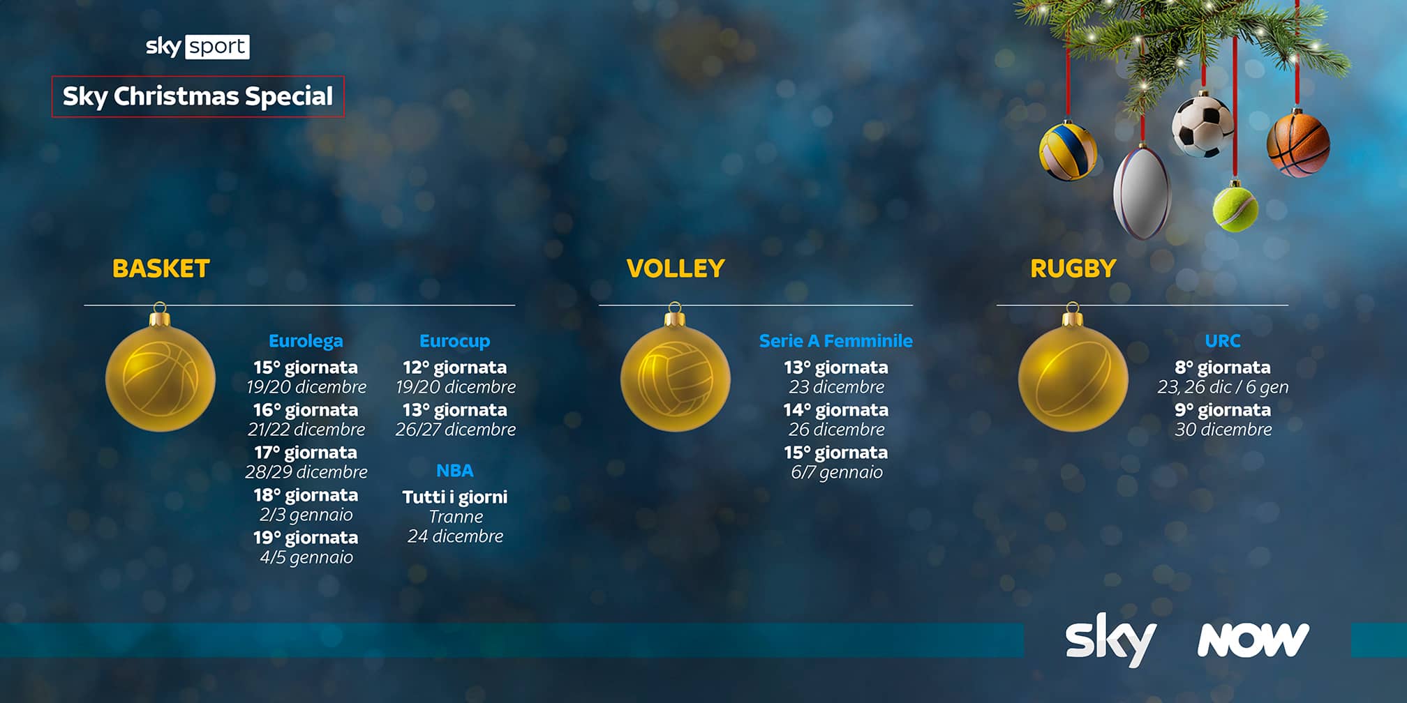 A questo si aggiungono le sfide sul campo, sempre in diretta per tutto il periodo delle feste: dal calcio con le partite di Serie A TIM, il Boxing Day di Serie BKT, la Serie C NOW, la Premier League, con i match del campionato inglese oltre a quelli di Bundesliga e Ligue 1, alle Coppe Europee di basket tra Eurolega ed Eurocup; dal Xmas Day di NBA al rugby, dalla pallavolo ai Campionati mondiali femminili di pallamano e tanto altro ancora.