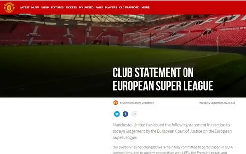 - La prima reazione ufficiale di un club è quella dei Manchester United: "La nostra posizione non è cambiata. Rimaniamo pienamente impegnati nella partecipazione alle competizioni Uefa e nella cooperazione positiva con Uefa, Premier League e altri club attraverso l'ECA sullo sviluppo continuo del gioco europeo.