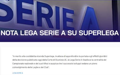 - “In merito alla cosiddetta vicenda Superlega, in attesa di approfondire la portata e gli effetti giuridici della decisione pubblicata oggi dalla Corte di Giustizia UE, la Lega Serie A ribadisce la centralità del Campionato nazionale e dei suoi tifosi e auspica che i successivi sviluppi vedano un pieno coinvolgimento delle Leghe e dei Club”.