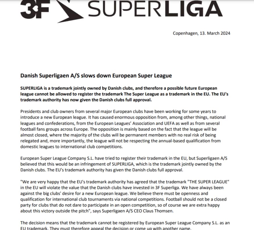 Il marcho Superliga è "proprietà congiunta dei club danesi", si legge nel comunicato diffuso dalla lega danese e firmato dall'amministratore delegato Claus Thomsen. "Siamo sempre stati contrari al progetto di una nuova lega europea. Crediamo che la qualificazione ai tornei internazionali debba avvenire tramite le competizioni nazionali. Siamo molto felici di questa vittoria extra campo".