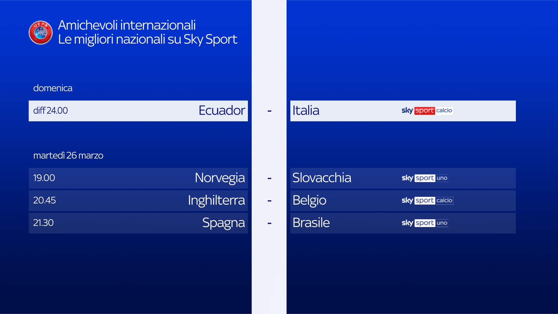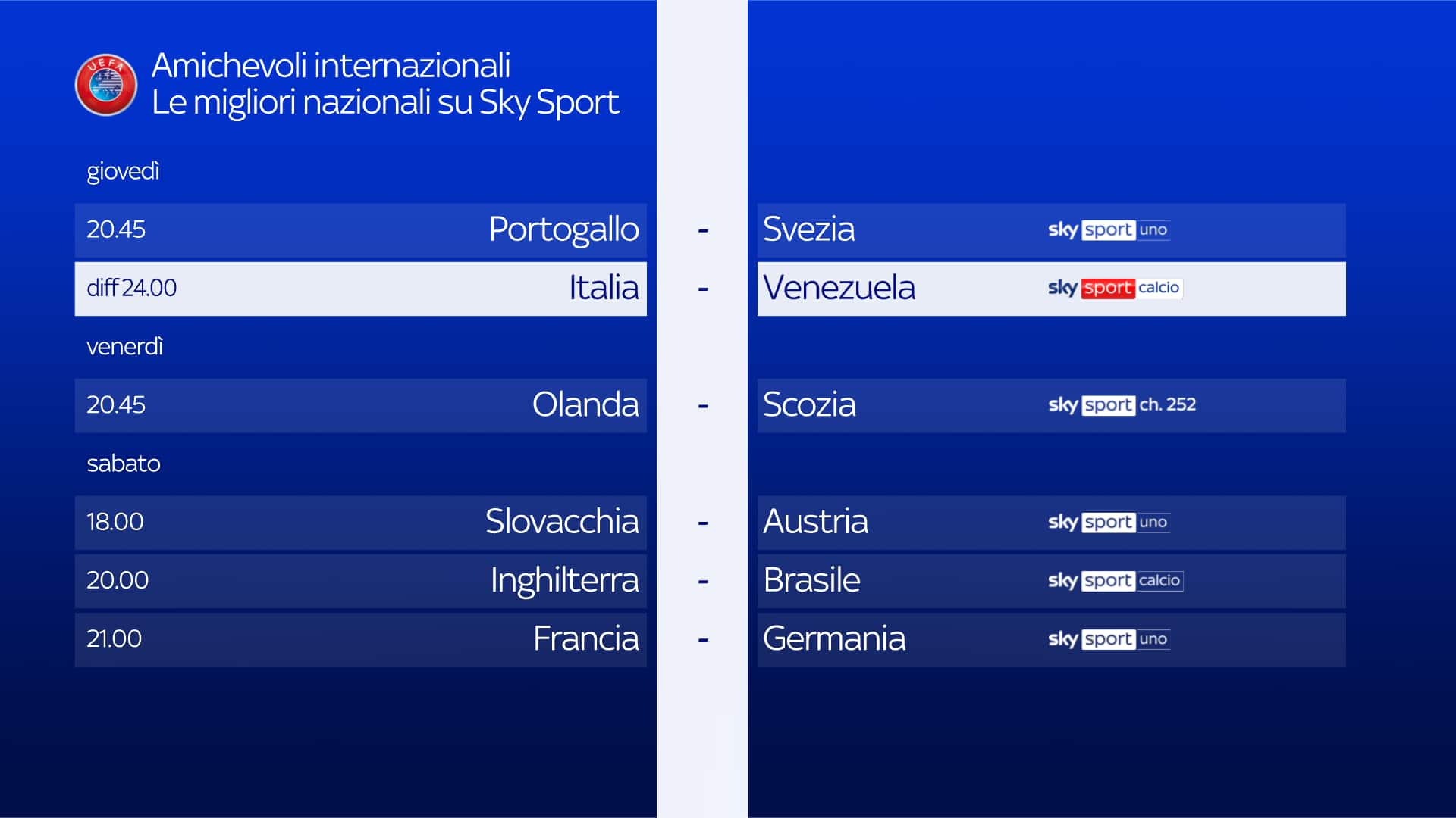 Si parte oggi alle 20.45, con Portogallo-Svezia (Sky Sport Uno e in streaming su NOW). Venerdì 22 marzo, alla stessa ora, in campo Olanda-Scozia su Sky Sport 252 e in streaming su NOW, mentre sabato saranno tre gli incontri in programma. Si parte alle 18 con Slovacchia-Austria (Sky Sport Uno e in streaming su NOW). Sfida di altissimo livello alle 20, quando a Wembley inizierà Inghilterra-Brasile (Sky Sport Calcio e in streaming su NOW). Grande classica del calcio europeo alle 21, con Francia-Germania che a Lione anticiperà i big match della fase finale dell’Europeo (Sky Sport Uno e in streaming su NOW). Ancora amichevoli martedì 26 marzo, con Norvegia-Slovacchia alle 19 (Sky Sport Uno e in streaming su NOW), Inghilterra-Belgio alle 20.45 (Sky Sport Calcio e in streaming su NOW), e Spagna-Brasile alle 21.30 (Sky Sport Uno e in streaming su NOW).