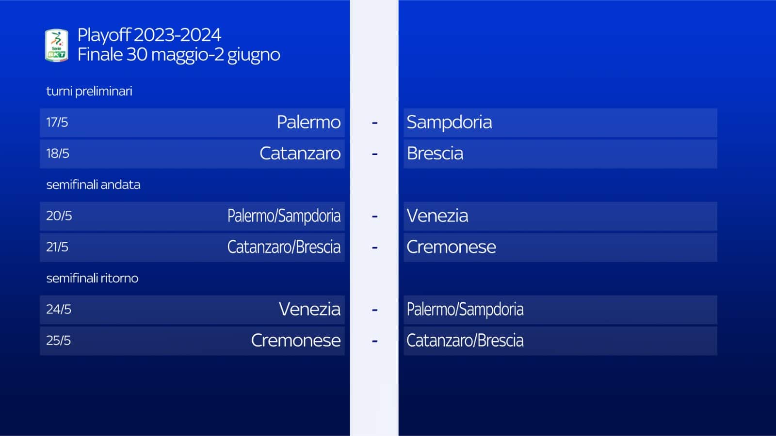 Tra venerdì 17 e sabato 18 maggio si giocano i turni preliminari di Serie B che daranno accesso alle semifinali. La Sampdoria gioca fuori casa a Palermo venerdì 17 maggio alle 20.30. La partita sarà trasmessa in diretta su Sky Sport 251 e in streaming su NOW. Mentre il Catanzaro affronterà in casa il Brescia sabato 18 maggio alle 20.30, in diretta su Sky Sport 252 e in streaming su NOW.