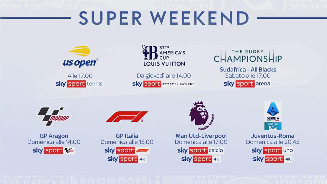 guida tvUna due giorni senza precedenti con il meglio dello sport mondiale da seguire in diretta su Sky Sport e in streaming su NOW. Dalla Serie A alla Premier League, dallo US Open di tennis all'America's Cup di vela, dal Gran Premio d'Italia in Formula 1 a quello d'Aragona in MotoGP. Eventi impossibili da perdere!