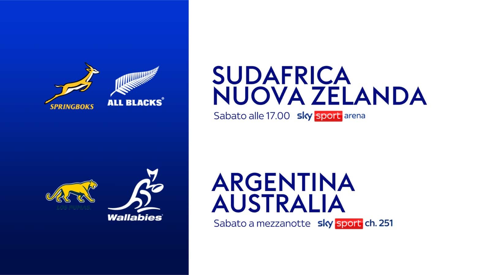Entrano nel vivo le sfide per le Nazionali dell’emisfero meridionale, anche quest’anno protagoniste del The Rugby Championship. La 3^ giornata, sabato 31 agosto, vede alle 17.00, in diretta su Sky Sport Arena e in streaming su NOW, il Sudafrica ospitare gli All Blacks della Nuova Zelanda all’”Emirates Airline Park” di Johannesburg. A mezzanotte è la volta della sfida tra l’Argentina e l’Australia. La diretta su Sky Sport 251 e in streaming su NOW, dall’ “Estadio Jorge Luis Hirschi” di Buenos Aires.