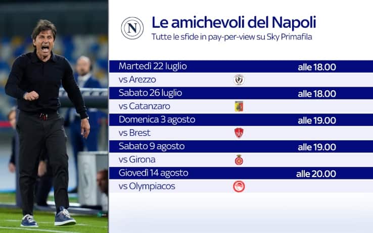 Si parte martedì 22 luglio con il primo dei cinque incontri del Napoli campione d’Italia. Alle 18.00 a Dimaro la sfida con l’Arezzo. Seconda sfida sabato 26 luglio alle 18.00 contro il Catanzaro. Castel di Sangro protagonista degli altri tre appuntamenti precampionato: domenica 3 agosto alle 19.00 la partita contro il Brest, sabato 9 agosto alle 19.00 sarà il turno del Girona, mentre l’ultimo appuntamento sarà il 14 agosto alle 20.00 contro l’Olympiakos. I 5 match degli Azzurri di Antonio Conte saranno disponibili in pay-per-view su Sky Sport 251.