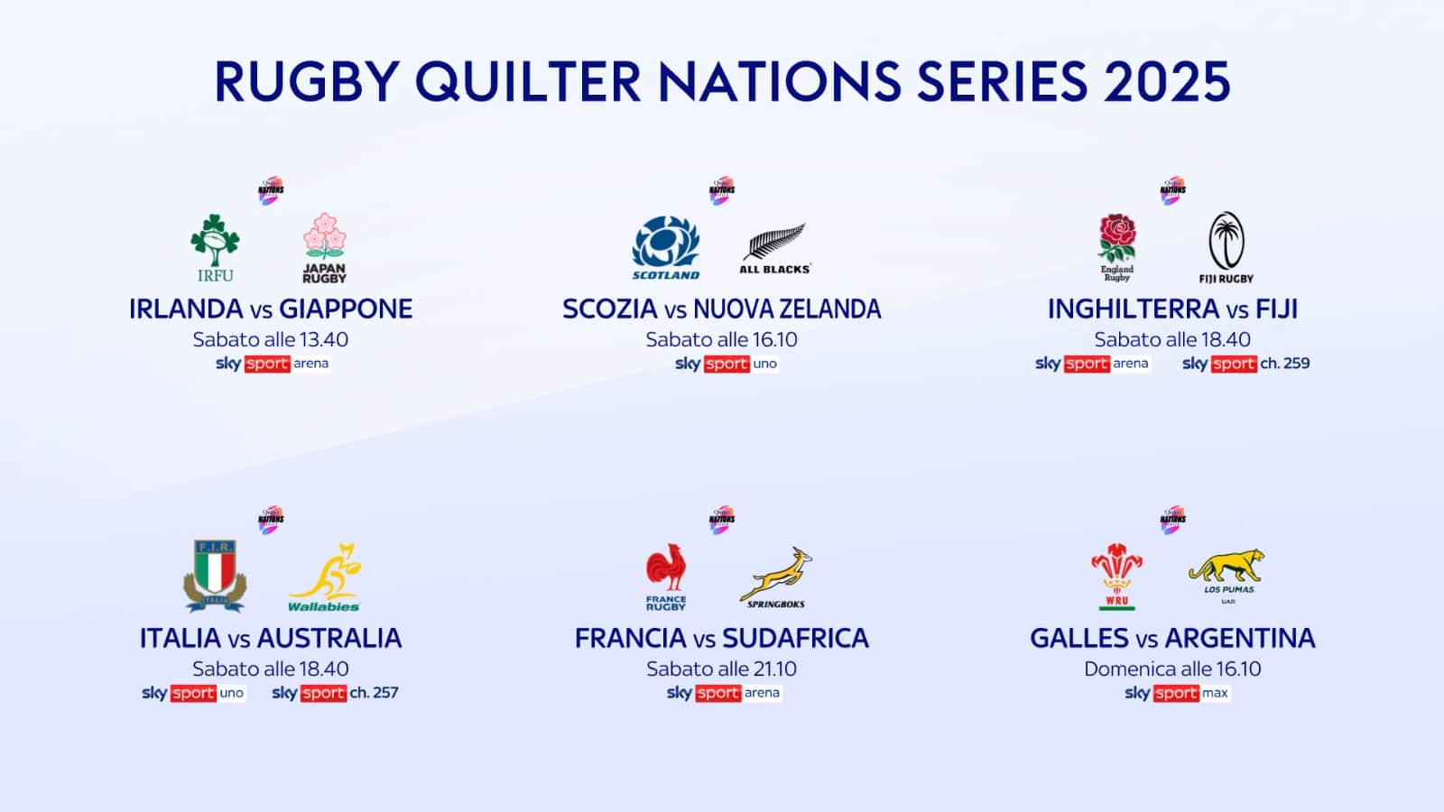 A novembre, come da tradizione, il meglio della palla ovale mondiale si confronta nelle "Quilter Nations Series" su Sky e in streaming su NOW, con tantissime sfide da vivere in diretta. Grande attesa soprattutto sabato 8 novembre per la partita che vedrà di fronte Italia e Australia a Udine, collocata all’interno di un vero e proprio sabato "mondiale", che vedrà in campo ben 9 delle prime 10 Nazionali della classifica globale: dal Sudafrica campione del mondo agli All Blacks, dalla Francia campione del 6 Nazioni alle tradizionali potenze europee Irlanda e Inghilterra. L’esordio degli Azzurri di Gonzalo Quesada al BluEnergy Stadium di Udine sarà contro una Nazionale temibile come l’Australia, al momento 7^ nel ranking mondiale. La diretta di Italia-Australia inizierà alle 18.10 su Sky Sport Uno, Sky Sport Max e in streaming su NOW.