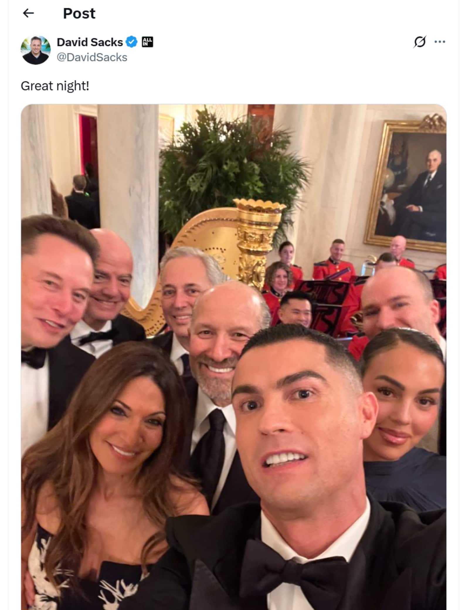 la pace in Medio Oriente. Alla cena presente anche Elon Musk, con il quale poi c'è stato un selfie di gruppo scattato dal campione portoghese.