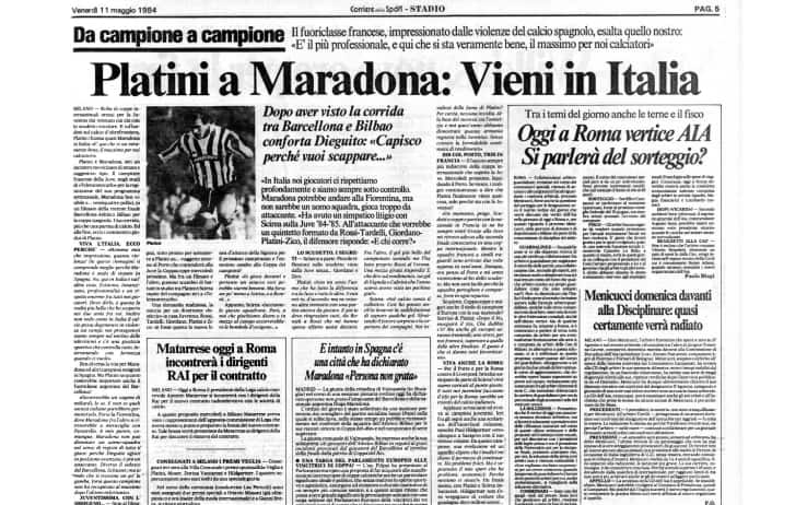 Maradona è il nome dei sogni e non può mancare al campionato più bello del mondo. Negli Anni 80, mentre l’Italia vive un miracolo economico più effimero di quello di vent’anni prima, il calcio tricolore è ricco, felice, in espansione come i suoi stadi, presto divorati dalla mangiatoia di Italia 90. L’inversione è avvenuta nel 1980, con la comparsa degli sponsor sulle maglie, i primi diritti tv e la riapertura delle frontiere agli stranieri, chiuse nel 1966 dopo la sconfitta contro la Corea. Falcao alla Roma, Brady alla Juventus, Prohaska all’Inter, Bertoni alla Fiorentina. Sarà l’argentino, campione del mondo del 1978, a segnare il primo gol straniero dopo la riapertura e sarà lui il compagno del primo Maradona nel Napoli 1984-85. All’ondata iniziale, dentro alla quale sono finiti parecchi bidoni, si sono aggiunte via via tutte le stelle del pianeta. Nell’82, all’indomani del Mondiale, la Juventus ha acquistato Michel Platini, tre volte dominatore dei marcatori in Serie A e vincitore, sempre per tre volte, del Pallone d’Oro. Platini è anche il grande protagonista dell’estate ‘84, visto che ha appena vinto il secondo scudetto bianconero di fila e ha conquistato – da capitano, leader e simbolo – l’Europeo con la Francia. È lui a invitare Maradona in Italia: ormai manca solo Diego. (lunedì 14 maggio).