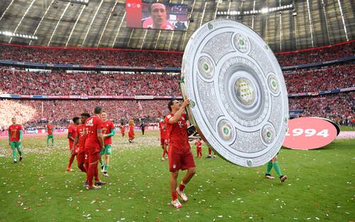 Con la vittoria sull'Eintracht (5-1) i bavaresi centrano all'ultima giornata il loro settimo titolo consecutivo. In gol anche Ribery e Robben, partiti dalla panchina e alla loro ultima partita con la maglia del Bayern, così come Rafinha. Lacrime e fiumi di birra in occasione del loro commosso saluto al club