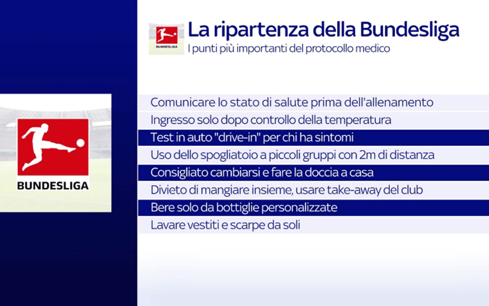 Oltre alle partite a porte chiuse, regole per gli allenamenti: prima di arrivare al campo, comunicazioni sullo stato di salute e test in auto per chi ha sintomi. Oppure cambiarsi e fare la doccia a casa. Durante le trasferte invece i medici dei club controlleranno gli hotel prima dell'arrivo dei giocatori, ci saranno spazi dedicati - come l'ingresso e gli ascensori - nessun contatto con il personale, 21 gradi la temperatura nelle stanza con umidità fra il 50% e il 60%.
