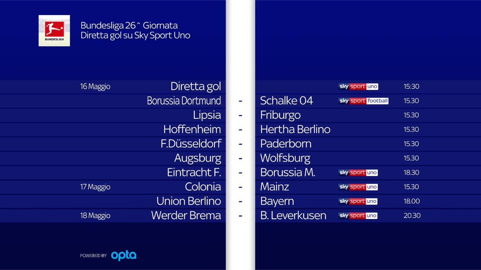 La Bundesliga riparte anche su Sky Sport. Augsburg-Wolfsburg sarà visibile all'interno di Diretta Gol sabato 16 maggio alle 15.20 su Sky Sport Uno, con altre 4 gare in contemporanea. Sempre sabato, alle 18.30, si giocherà Eintracht Francoforte-Borussia Monchengladbach (diretta su Sky Sport Uno). La domenica su Sky Sport Uno saranno in diretta Colonia-Mainz (15.30) e Union Berlino-Bayern Monaco (18), mentre il programma della 26^ giornata si chiuderà lunedì sera alle 20.30 con Werder Brema-Bayer Leverkusen, su Sky Sport Uno.