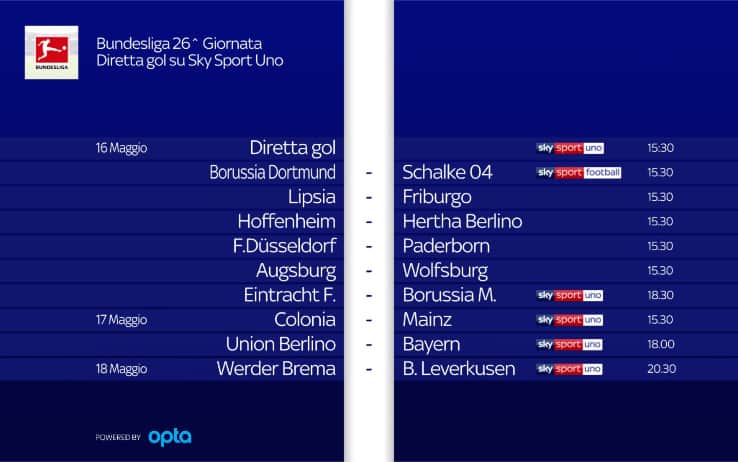 Il conto alla rovescia per la ripresa del calcio giocato è finito. E' la Bundesliga la prima a ricominciare. Il calcio tedesco torna in campo infatti nel weekend per la 26^ giornata: tutte le 9 partite in programma saranno trasmesse in esclusiva su Sky Sport. Si parte sabato 16 maggio alle 14:30 su Sky Sport Football con Bundesliga Live: lo studio che introdurrà i match del pomeriggio, condotto da Federica Lodi e con la partecipazione di Massimo Marianella, Riccardo Gentile e Niccolò Omini. Poi, alle 15:30, le prime cinque partite, tra cui il derby della Ruhr tra Borussia Dortmund e Schalke 04 su Sky Sport Football. Tutte le reti e le azioni migliori del pomeriggio saranno disponibili grazie a Diretta Gol Bundesliga, sempre alle 15:30 su Sky Sport Uno. Alle 18:30 Eintracht Francoforte-Borussia Moenchengladbach sarà il posticipo del sabato. La 26^ giornata prosegue domenica, con Colonia-Mainz alle 15:30 e il Bayern capolista di scena a Berlino contro l'Union alle 18. Chiude il programma Werder Brema-Bayer Leverkusen, lunedì alle 20:30. Di seguito tutte le indicazioni per seguire la Bundesliga su Sky.