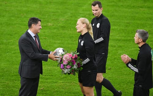 Un bouquet di fiori prima del fischio d'inizio alla signora Steinhaus, che nel 2017 è stata anche la prima donna a dirigere un match di Bundesliga (Herta Berlino e Werder Brema), poi entrata in pianta stabile nelle rotazioni arbitrali.