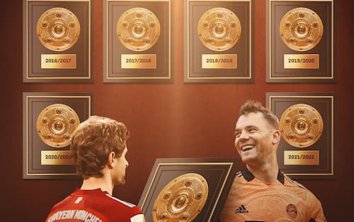 Manuel Neuer e Thomas Muller appendono sulla parete l'ultimo Meisterschale conquistato. Entrambi li hanno vinti tutti da protagonisti