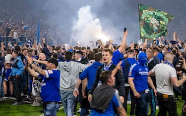 A quel punto è iniziata la festa: i tifosi dello Schalke hanno prima esultato sugli spalti, poi hanno invaso il campo per celebrare la promozione insieme ai giocatori.
