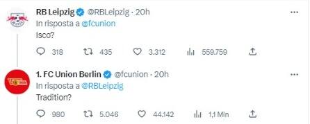 Proprio mentre si chiudeva il mercato, l'Union Berlin si preparava a scendere in campo in DFB Pokal contro il Wolfsburg. Un'ora prima del match, come di consueto, il club ha pubblicato la formazione ufficiale su Twitter. Tra le risposte arrivate c'era anche quella del Lipsia che ha "punzecchiato" l'Union chiedendo dove fosse Isco. Immediata la risposta della società di Berlino con un "Tradizione?", puntando sulla poca storia del club di proprietà Red Bull.
