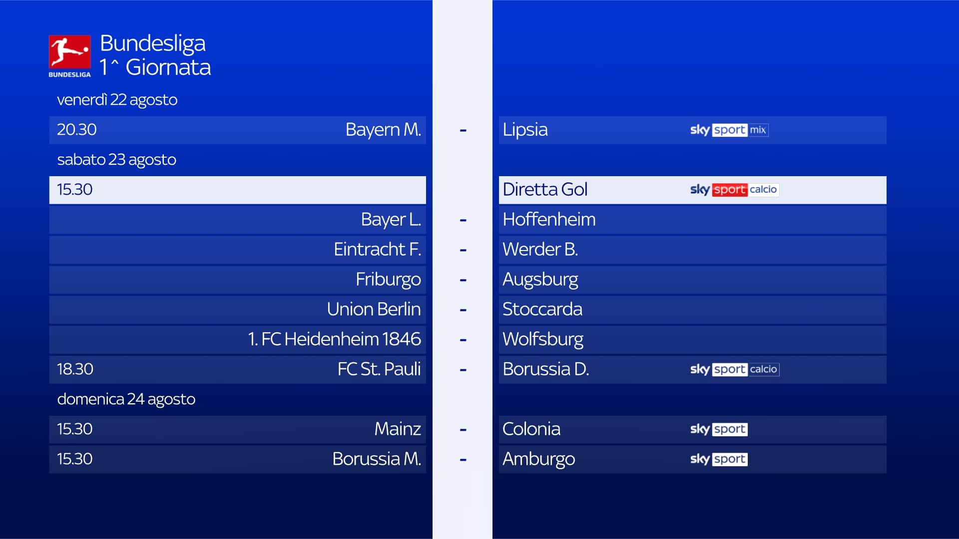 Inoltre, sui canali Sky Sport anche il meglio della Coppa di Germania, con le sfide più interessanti e decisive, e 2 partite per ogni turno di Bundesliga 2, la seconda serie del campionato. La stagione del calcio tedesco, come da tradizione, scatterà con la Supercoppa “Franz Beckenbauer”, VfB Stoccarda-FC Bayern Monaco, live sabato 16 agosto alle 20.30. Highlights, notizie e approfondimenti sulla Bundesliga sette giorni su sette anche su skysport.it, con gli approfondimenti dedicati di Sky Sport Insider, lo spazio premium del sito di Sky Sport, e sui canali social di Sky Sport.