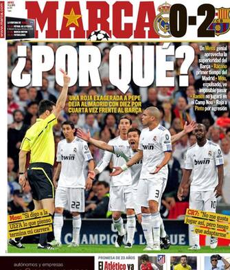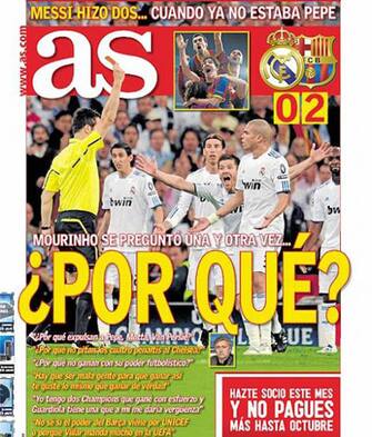 Completamente differenti le prime pagine dei quotidiani sportivi di Madrid. Marca riprende Mou e si chiede "Perché? Un rosso esagerato lascia il Real Madrid in 10 per la quarta volta contro il Barça"