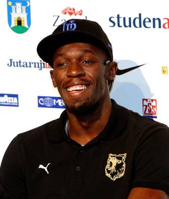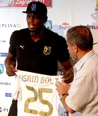 Usain Bolt si fa fotografare con il sindaco di Zagabria Milan Bandic alla vigilia del meeting internazionale di atletica. Tra le mani ha la maglia numero 25 del Real Madrid, personalizzata per lui