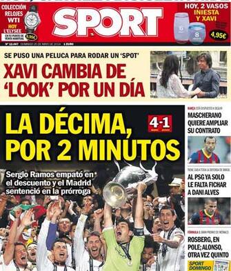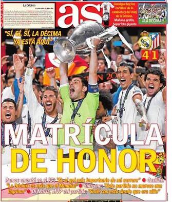 LA FOTOGALLERY. Tutti i quotidiani, di Madrid e non solo, sportivi e non, esaltano la Decima Champions conquistata dai blancos nella finalissima di Lisbona con l’Atletico. Da Marca ad As, ma anche El Pais e l'Equipe celebrano il trionfo merengue. I VIDEO